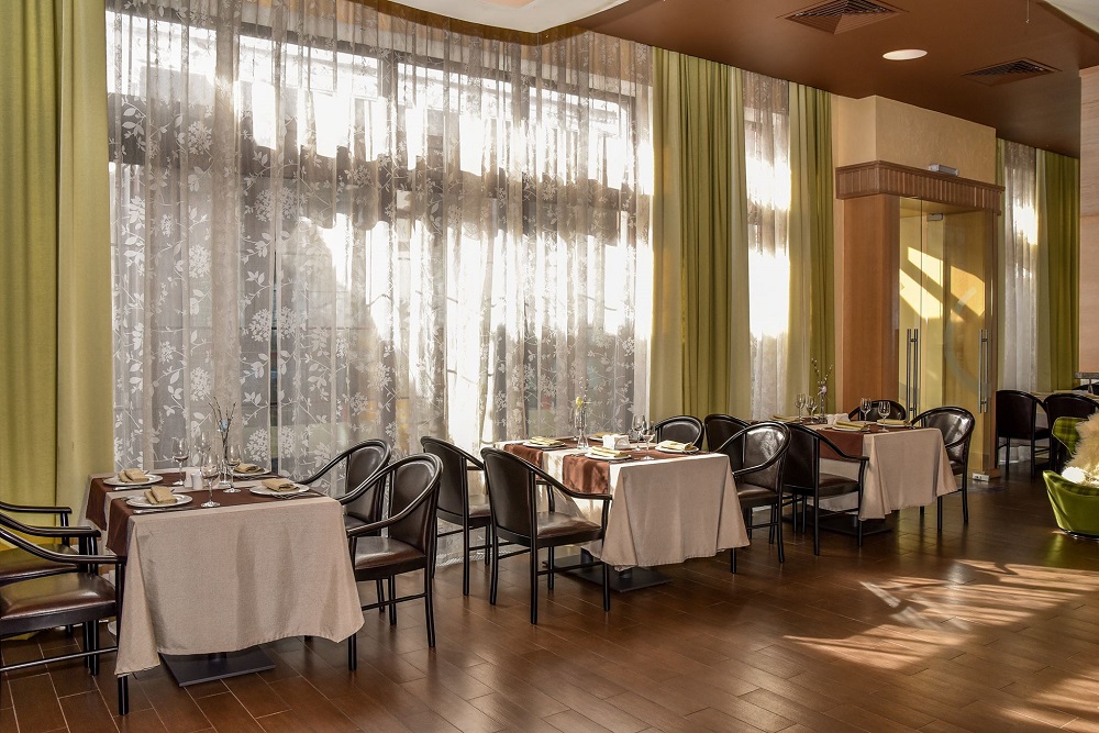 Просторный зал ресторана «Баскюль» с большими витринными окнами, камином и классическим средиземноморским интерьером рассчитан на 50 человек.